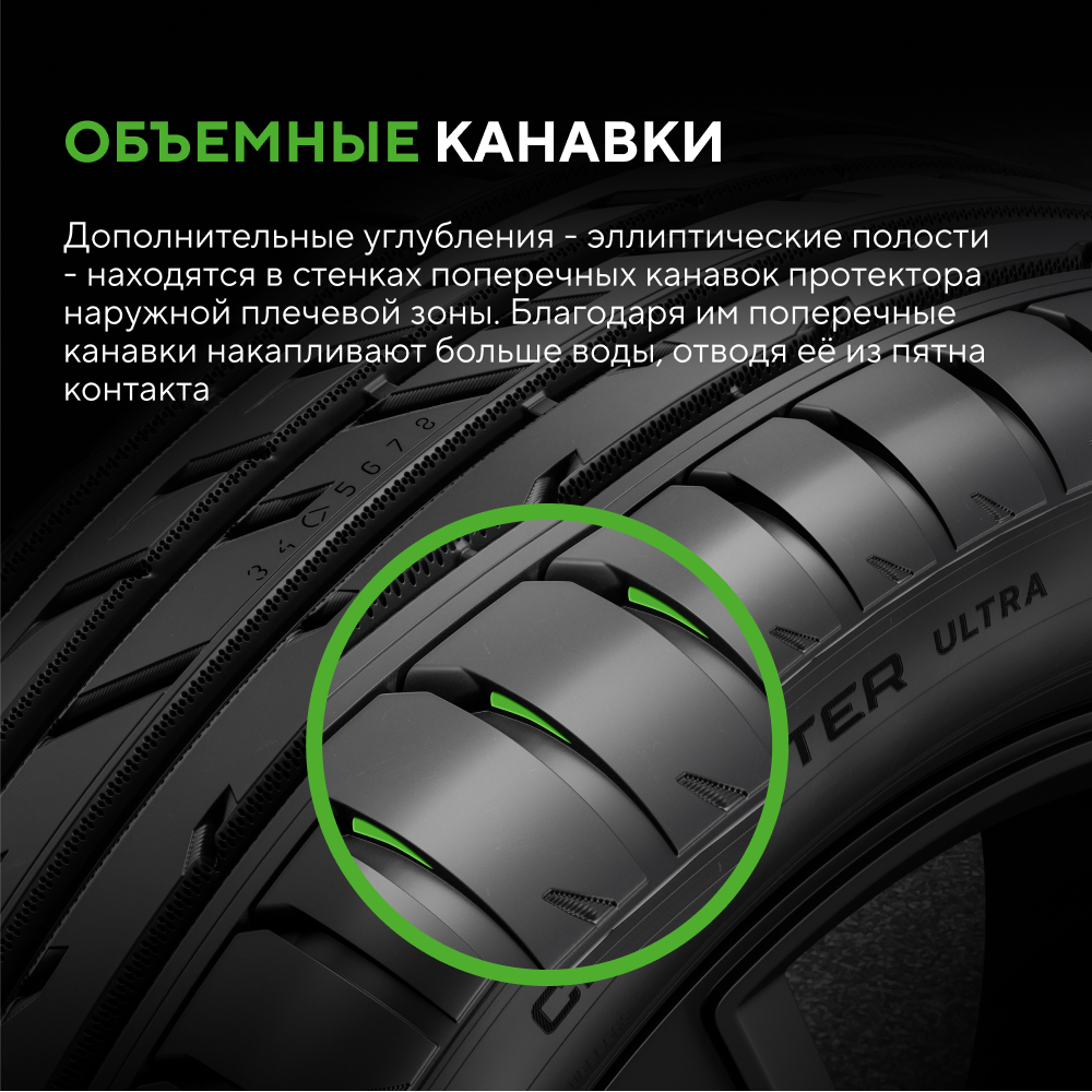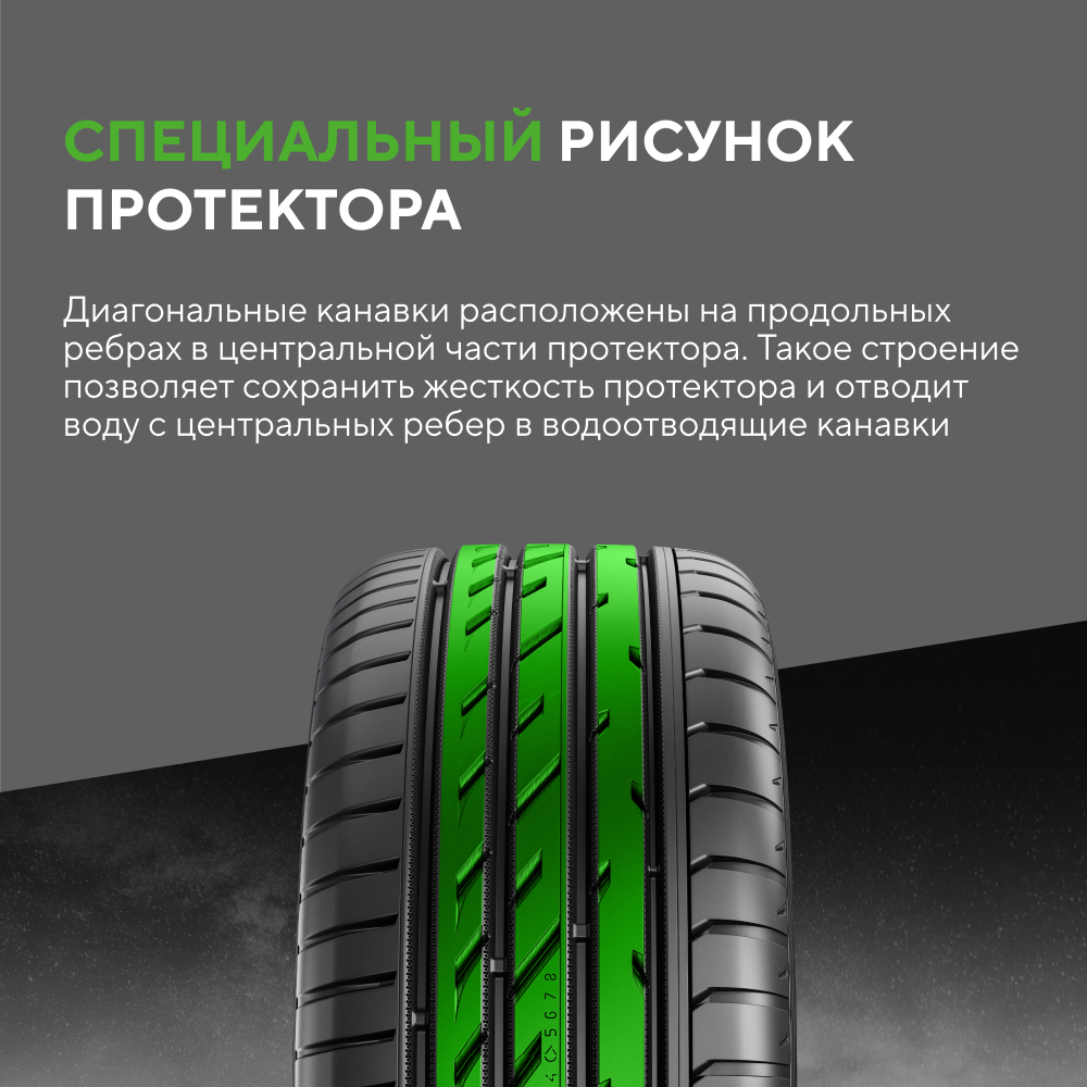 Рисунок протектора разработан для скоростной езды. Ребра в центральной части обеспечивают стабильность при прямолинейном движении и точную реакцию на рулевое управление.